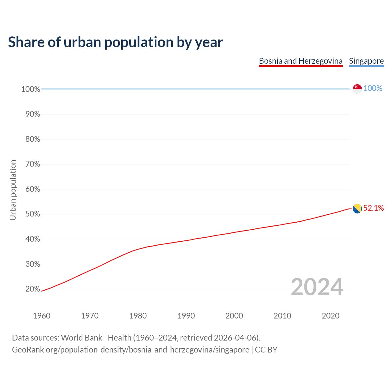 From 2004 to 2024, the share of urban population changed from 43.8% to 52.1% in Bosnia and Herzegovina and from 100% to 100% in Singapore.