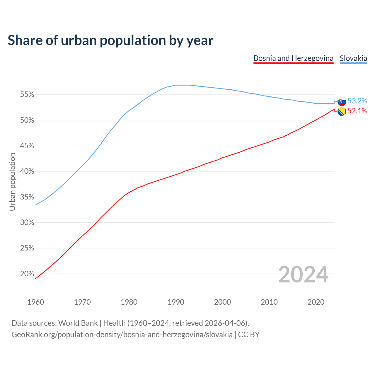From 2004 to 2024, the share of urban population changed from 43.8% to 52.1% in Bosnia and Herzegovina and from 55.6% to 53.2% in Slovakia.