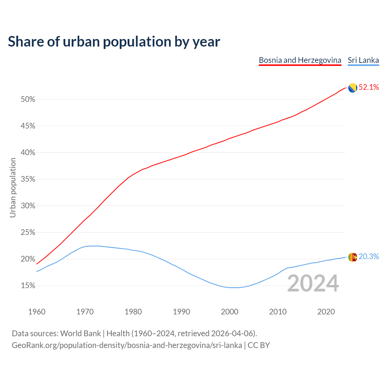 From 2004 to 2024, the share of urban population changed from 43.8% to 52.1% in Bosnia and Herzegovina and from 14.9% to 20.3% in Sri Lanka.