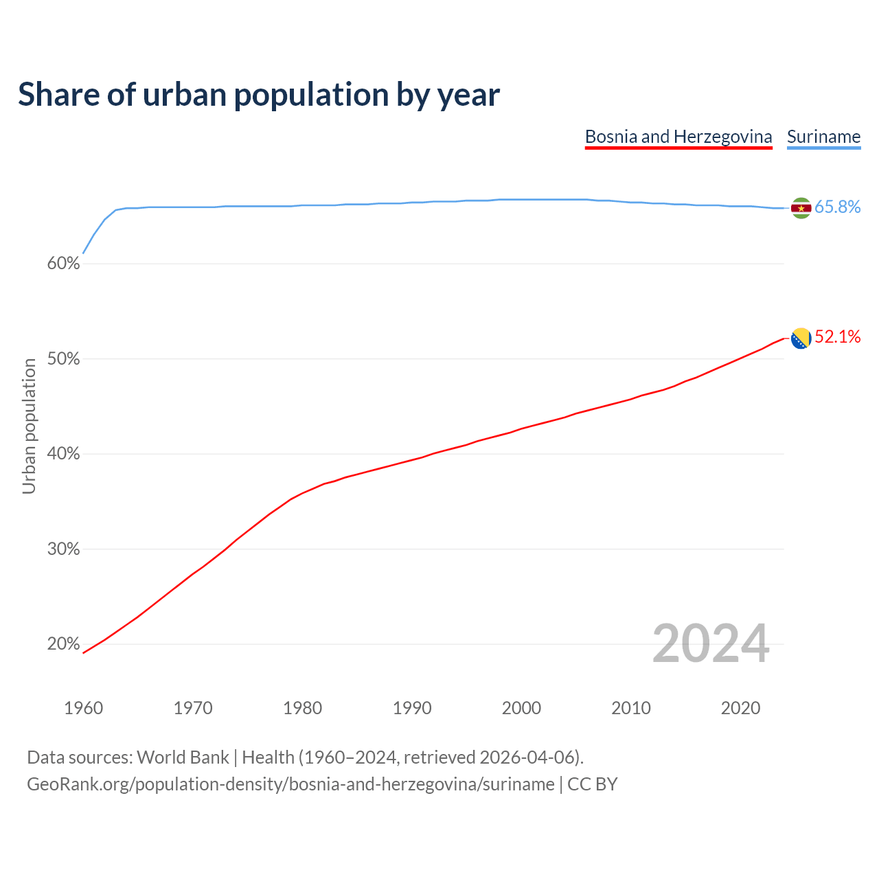 From 2004 to 2024, the share of urban population changed from 43.8% to 52.1% in Bosnia and Herzegovina and from 66.7% to 65.8% in Suriname.