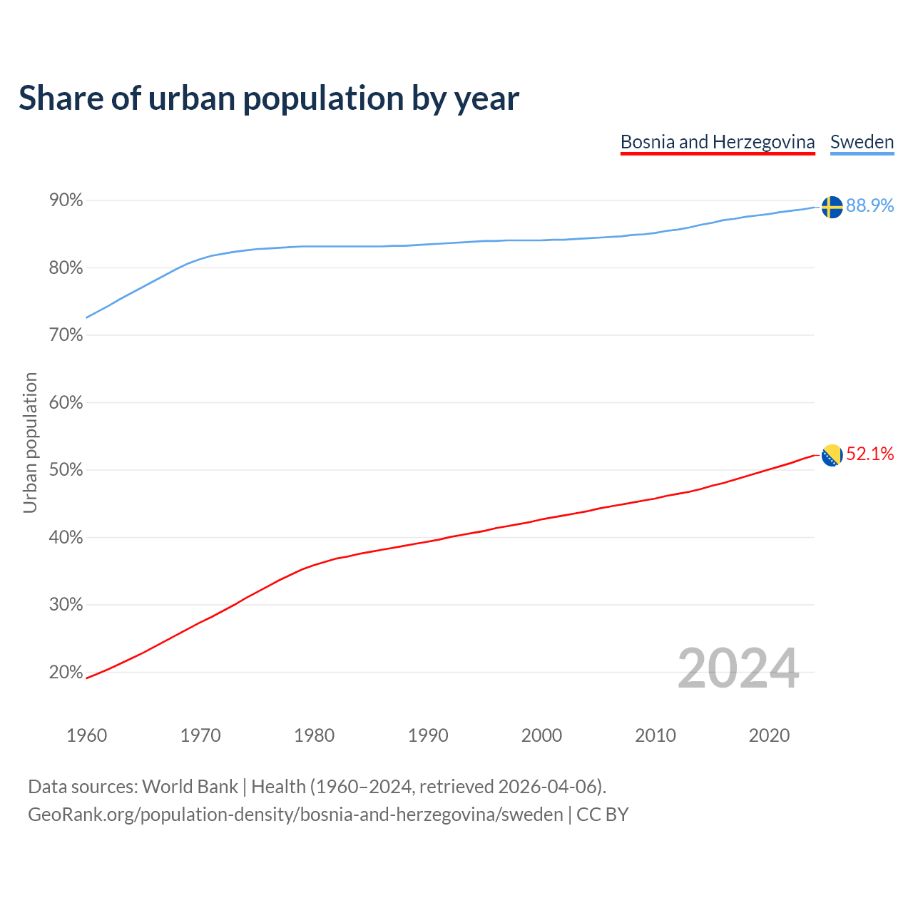 From 2004 to 2024, the share of urban population changed from 43.8% to 52.1% in Bosnia and Herzegovina and from 84.3% to 88.9% in Sweden.