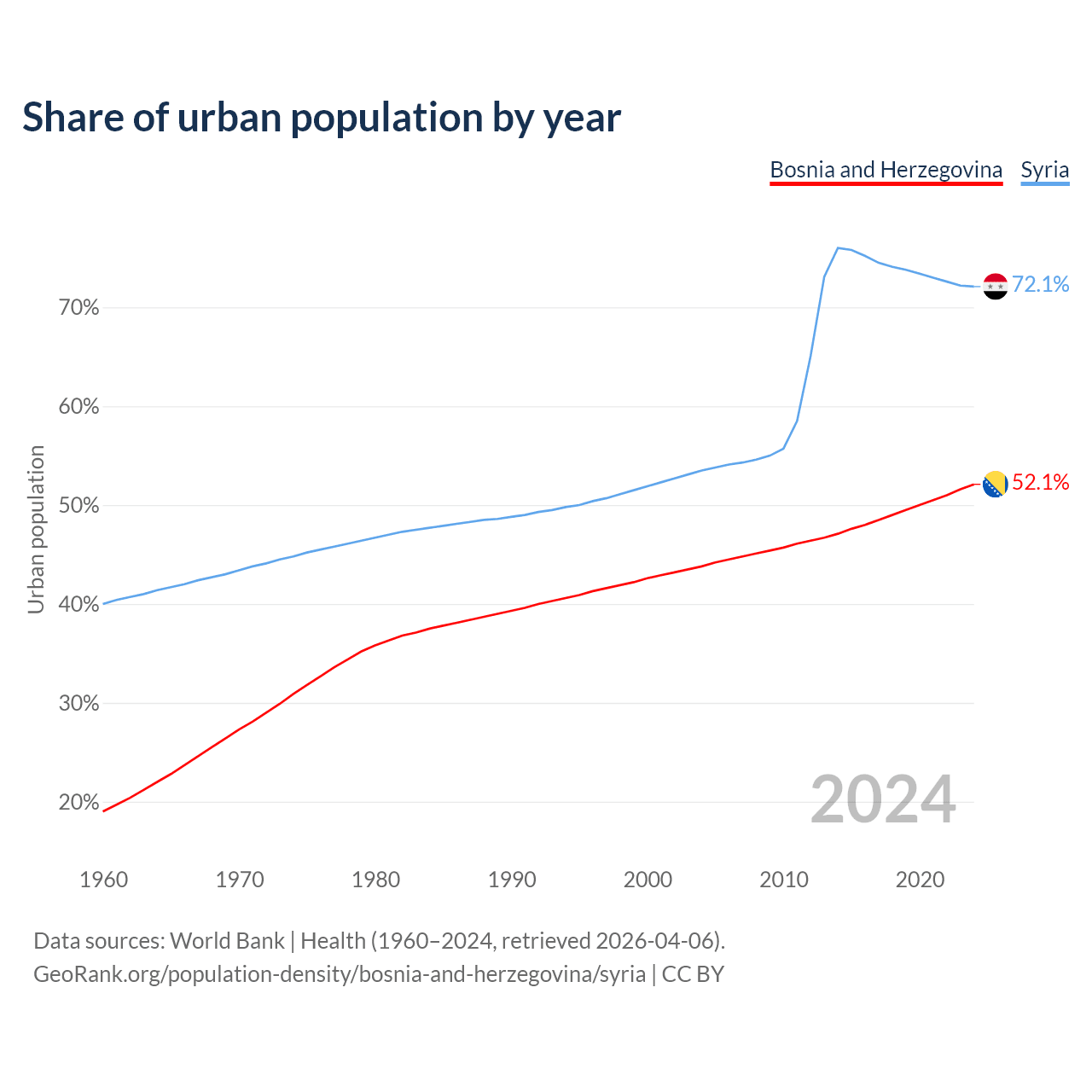 From 2004 to 2024, the share of urban population changed from 43.8% to 52.1% in Bosnia and Herzegovina and from 53.5% to 72.1% in Syria.