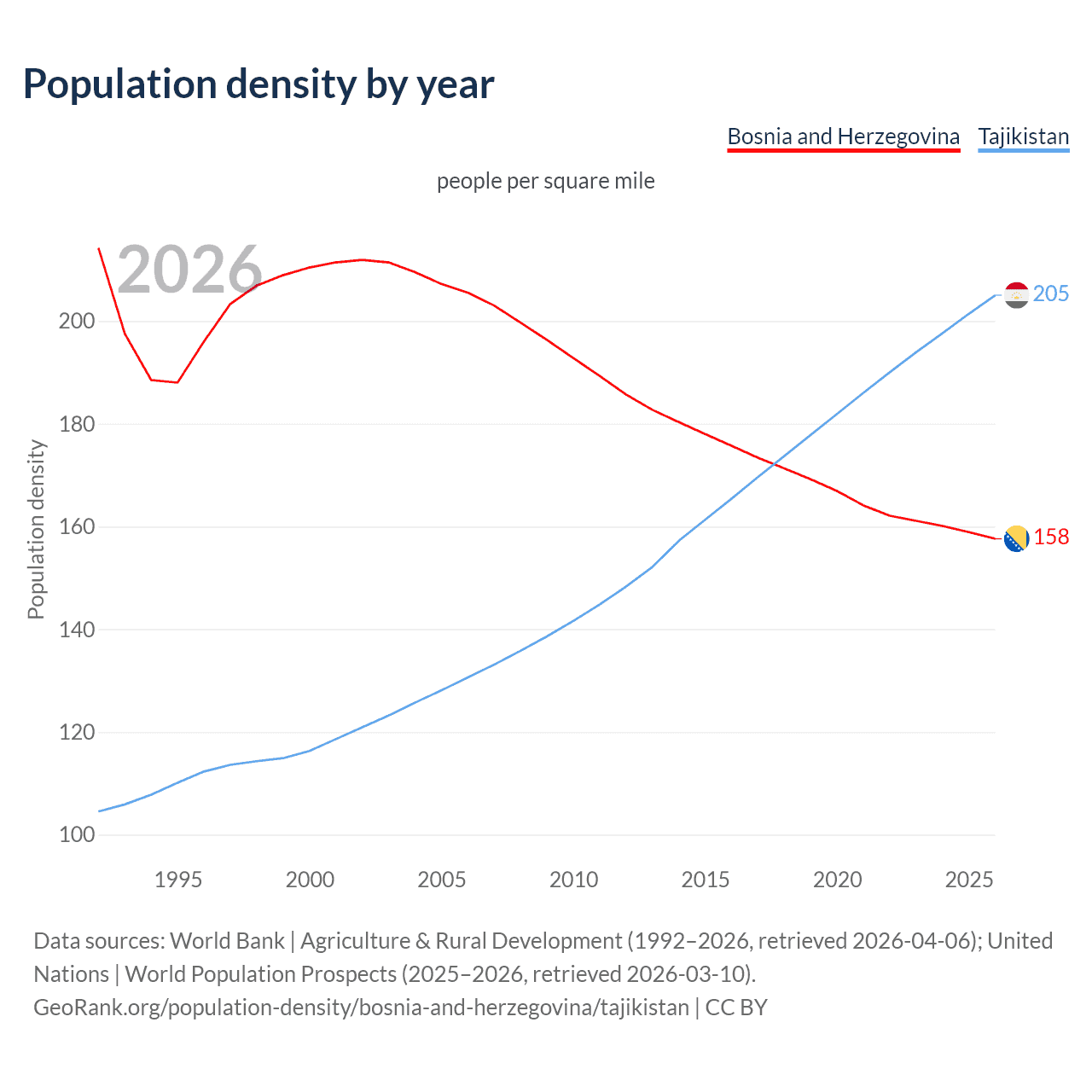From 2006 to 2026, population density in Bosnia and Herzegovina decreased by 23.3%, compared to a 57% growth in Tajikistan.