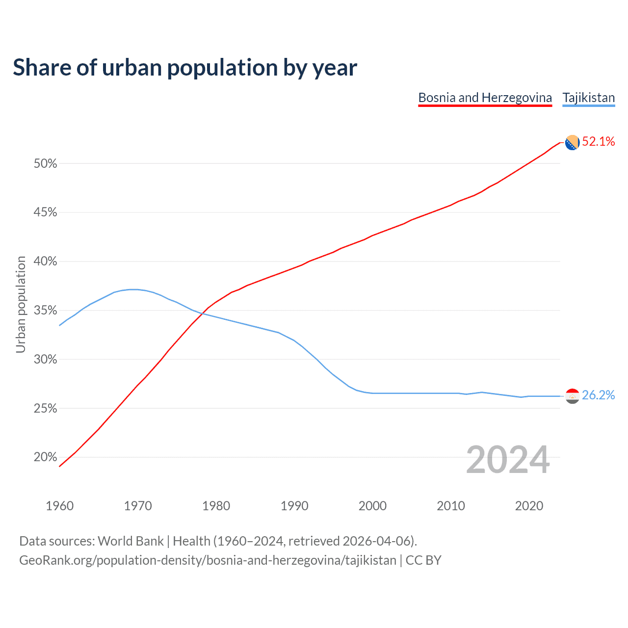 From 2004 to 2024, the share of urban population changed from 43.8% to 52.1% in Bosnia and Herzegovina and from 26.5% to 26.2% in Tajikistan.