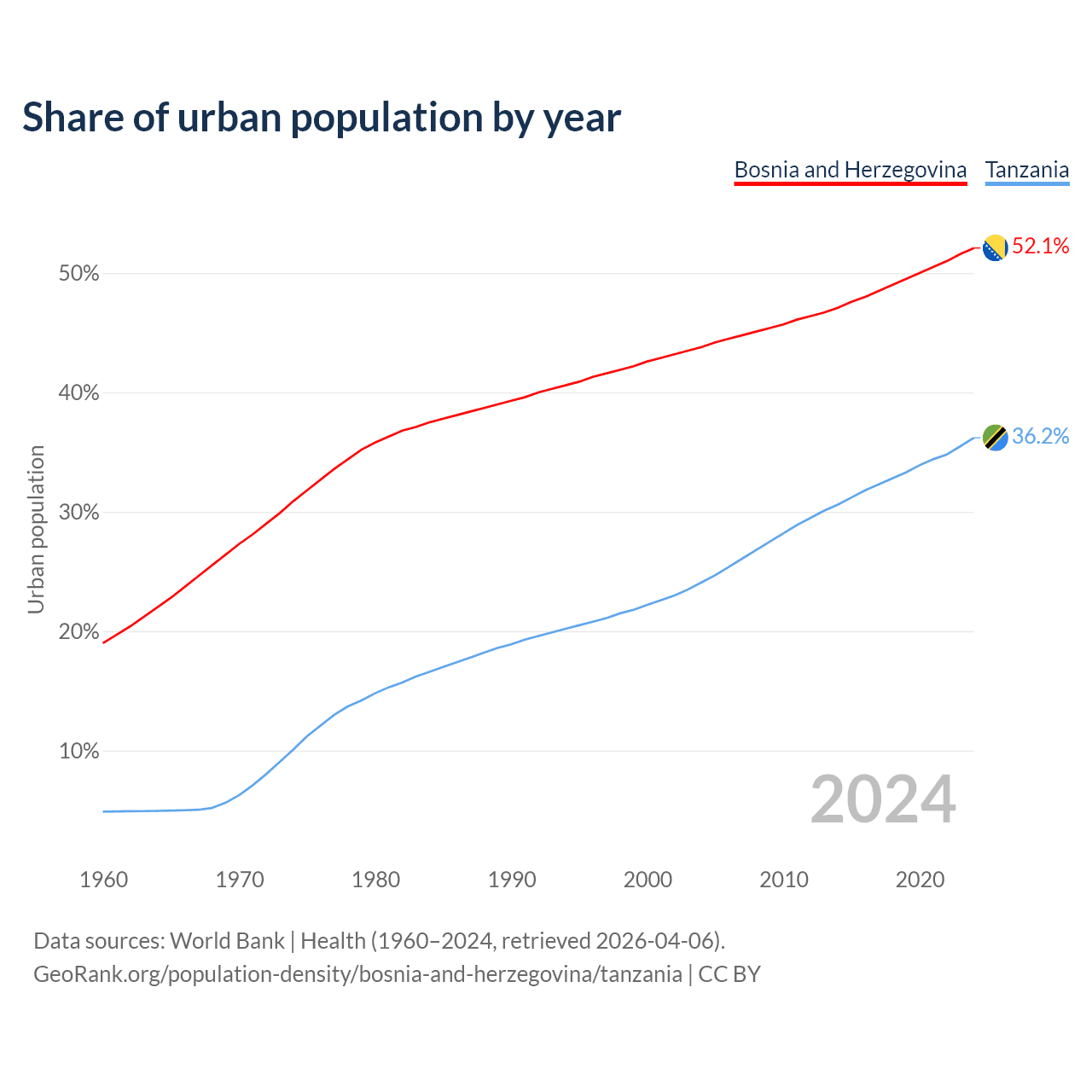 From 2004 to 2024, the share of urban population changed from 43.8% to 52.1% in Bosnia and Herzegovina and from 24.1% to 36.2% in Tanzania.