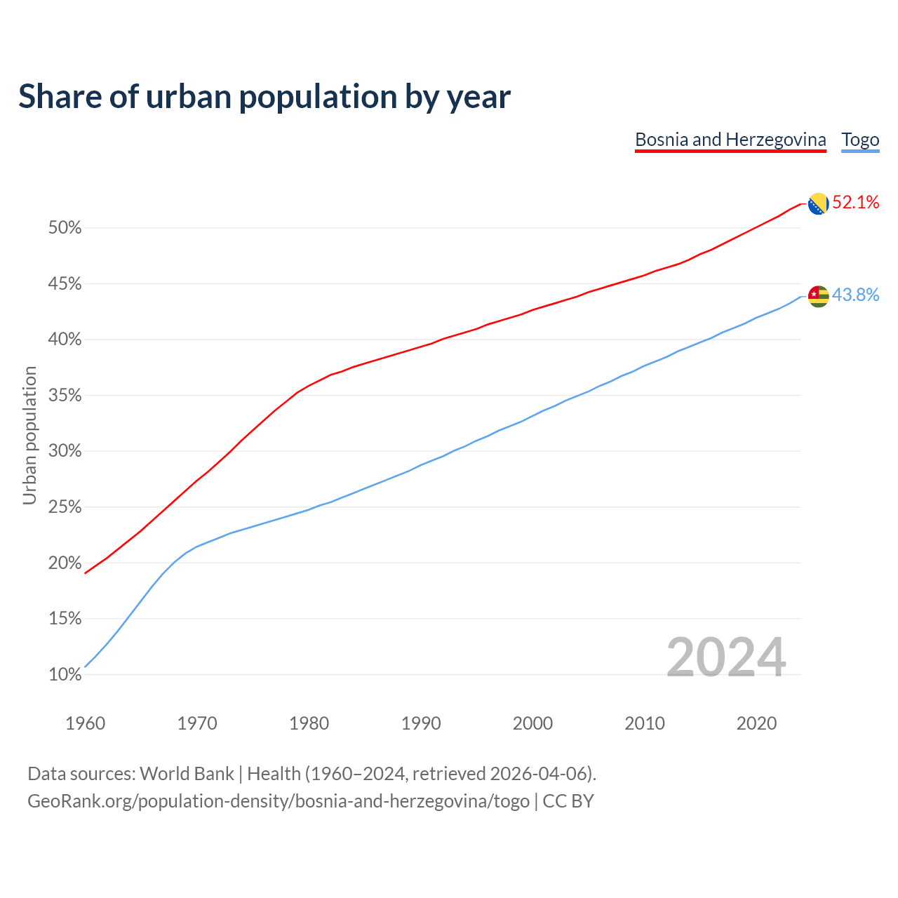 From 2004 to 2024, the share of urban population changed from 43.8% to 52.1% in Bosnia and Herzegovina and from 34.9% to 43.8% in Togo.