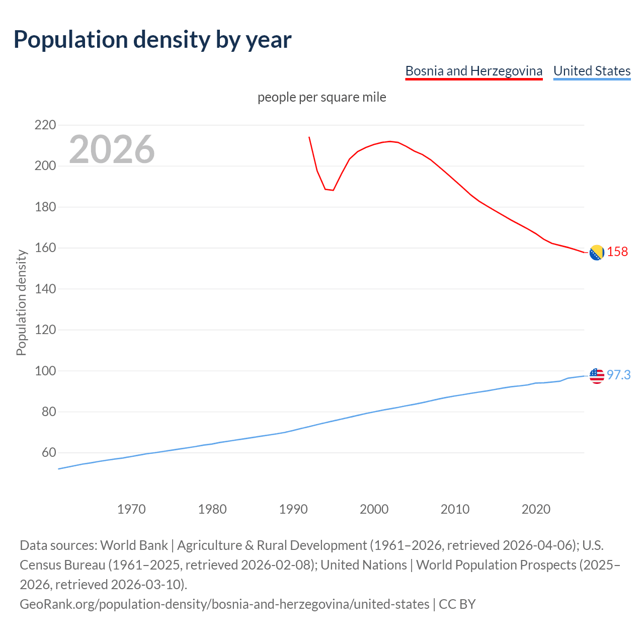 From 2006 to 2026, population density in Bosnia and Herzegovina decreased by 23.3%, compared to a 15.3% growth in the United States.
