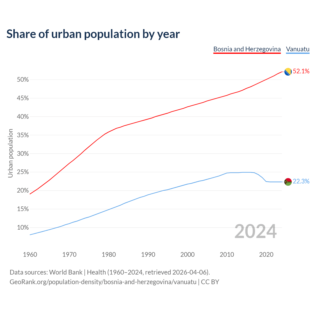 From 2004 to 2024, the share of urban population changed from 43.8% to 52.1% in Bosnia and Herzegovina and from 22.7% to 22.3% in Vanuatu.