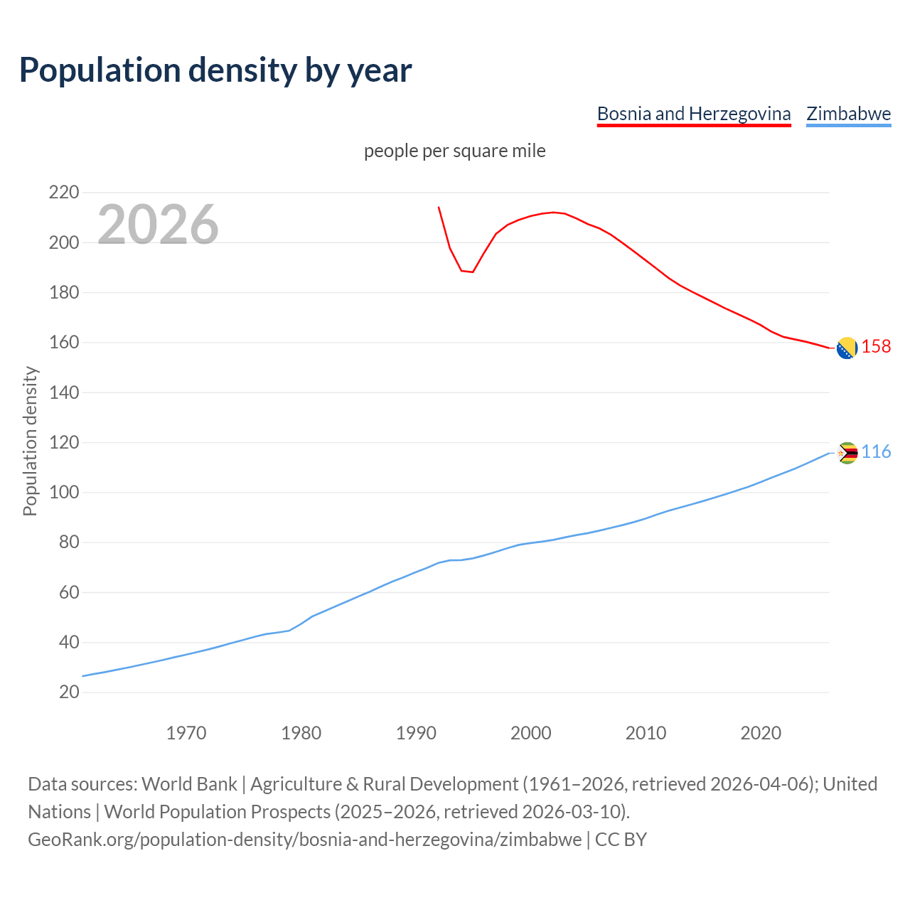 From 2006 to 2026, population density in Bosnia and Herzegovina decreased by 23.3%, compared to a 36.7% growth in Zimbabwe.