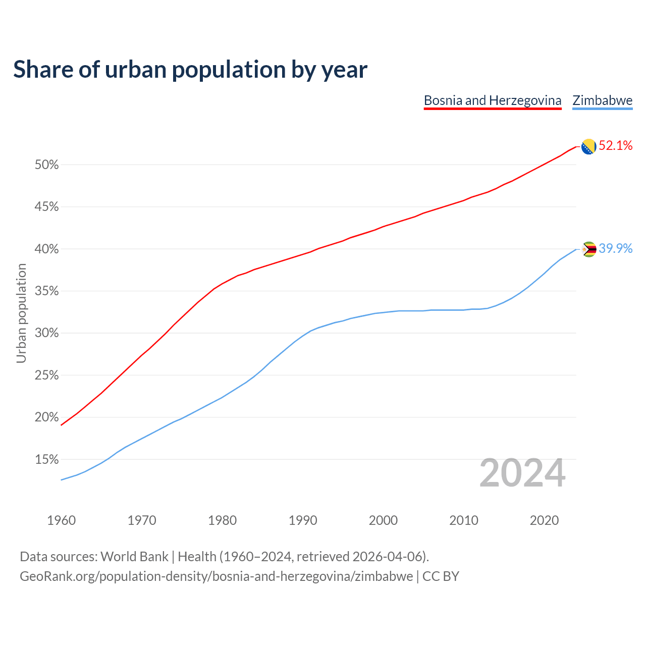 From 2004 to 2024, the share of urban population changed from 43.8% to 52.1% in Bosnia and Herzegovina and from 32.6% to 39.9% in Zimbabwe.