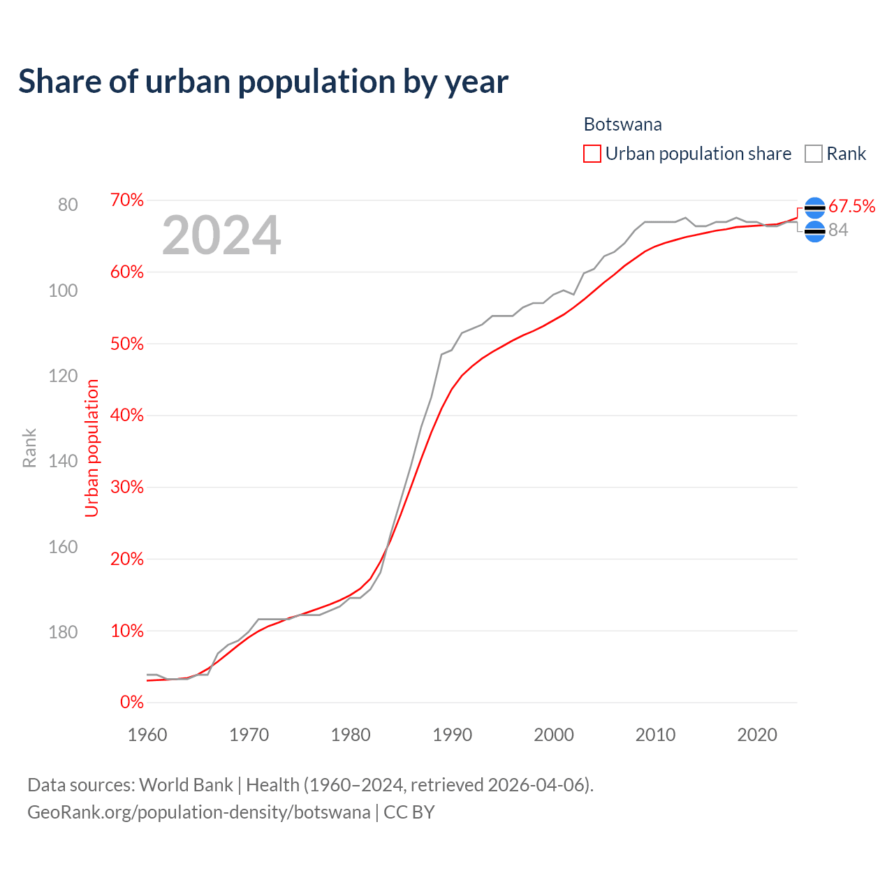 This chart shows the share of urban population in Botswana from 1960 to 2024: 3% lived in urban areas in 1960, 53.2% in 2000, and 67.5% in 2024.