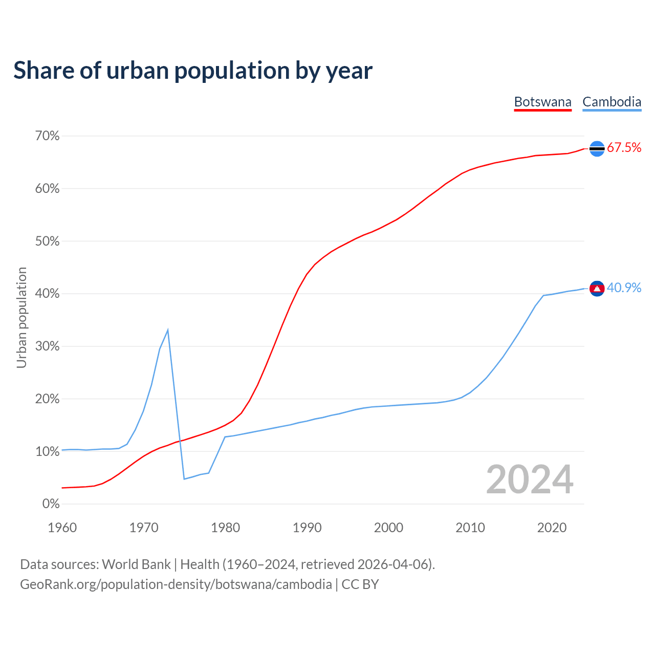 From 2004 to 2024, the share of urban population changed from 57.3% to 67.5% in Botswana and from 19% to 40.9% in Cambodia.