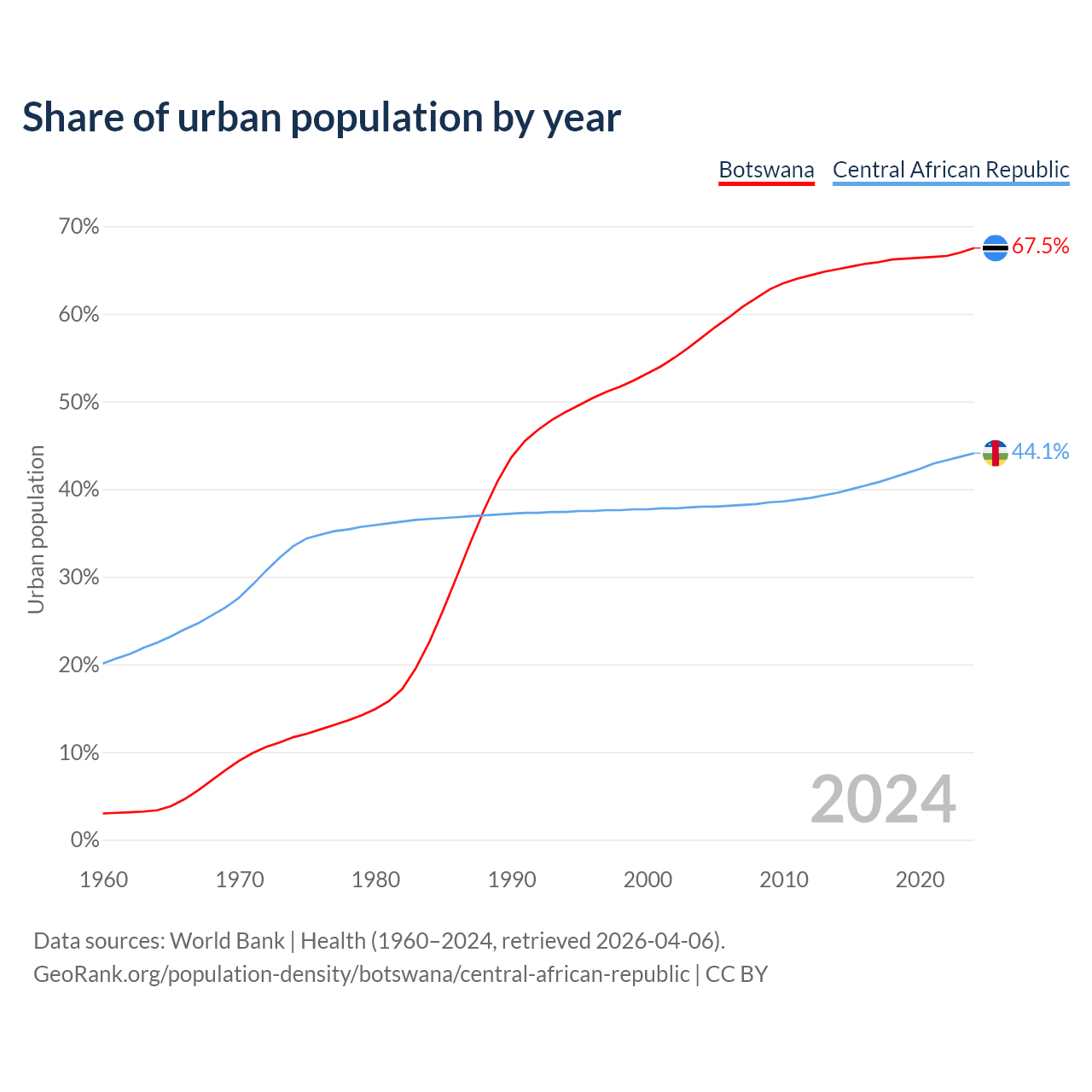 From 2004 to 2024, the share of urban population changed from 57.3% to 67.5% in Botswana and from 38% to 44.1% in the Central African Republic.