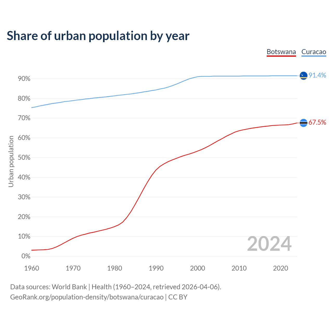 From 2004 to 2024, the share of urban population changed from 57.3% to 67.5% in Botswana and from 91.2% to 91.4% in Curacao.