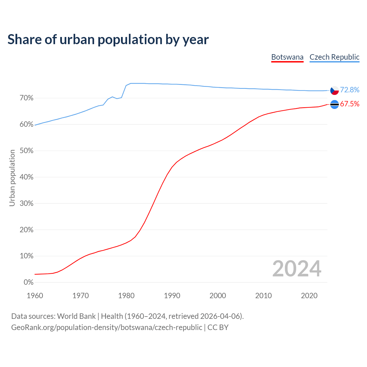 From 2004 to 2024, the share of urban population changed from 57.3% to 67.5% in Botswana and from 73.7% to 72.8% in the Czech Republic.