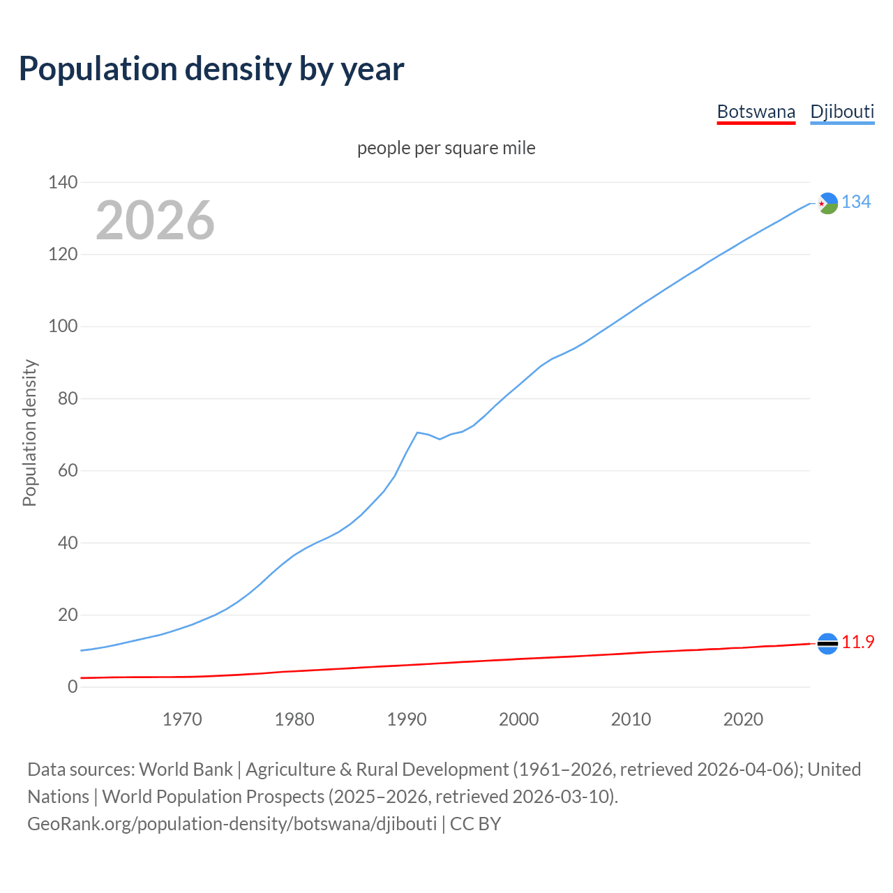 From 2006 to 2026, population density in Botswana increased by 38.9%, compared to a 40.2% growth in Djibouti.