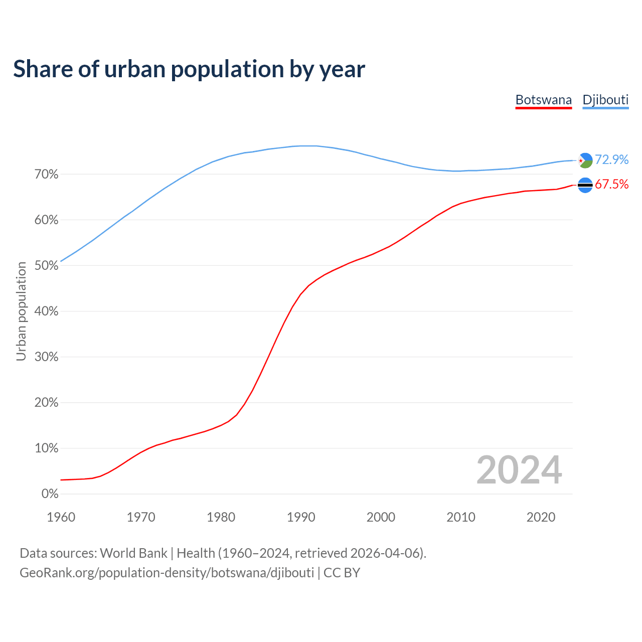From 2004 to 2024, the share of urban population changed from 57.3% to 67.5% in Botswana and from 71.6% to 72.9% in Djibouti.