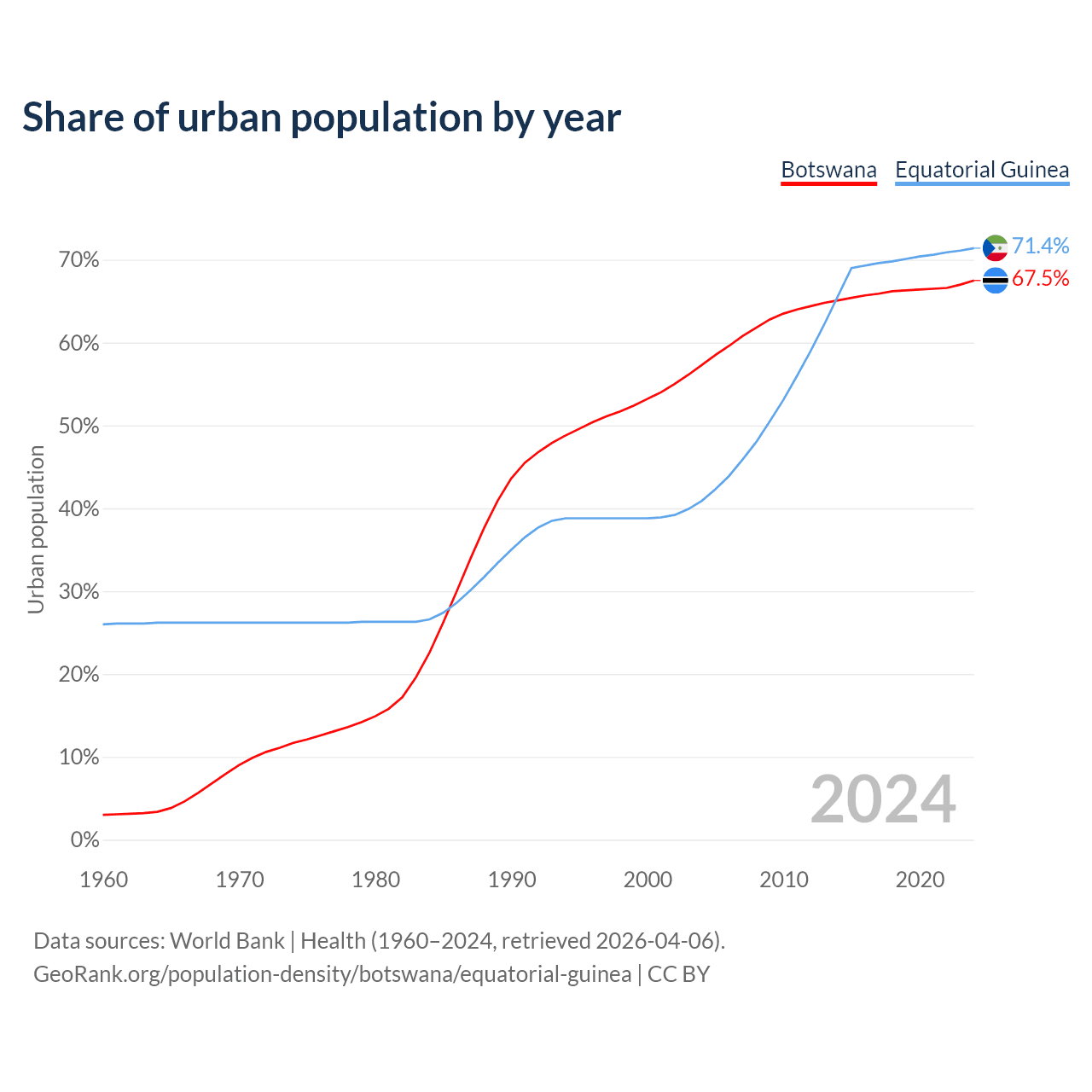 From 2004 to 2024, the share of urban population changed from 57.3% to 67.5% in Botswana and from 40.9% to 71.4% in Equatorial Guinea.