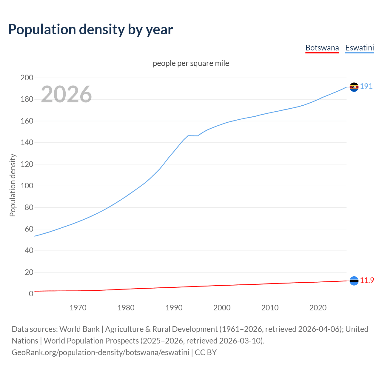 Botswana has a population density of 11.9 people per square mile compared to 191.2 people in Eswatini. Botswana has 2,483,705 sq ft of land per person vs 150,387 sq ft in Eswatini. Botswana and Eswatini rank 190th and 118th by population density, respectively.