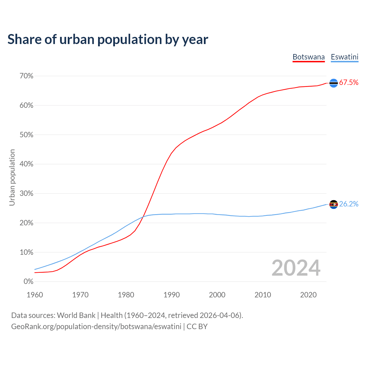 From 2004 to 2024, the share of urban population changed from 57.3% to 67.5% in Botswana and from 22.3% to 26.2% in Eswatini.