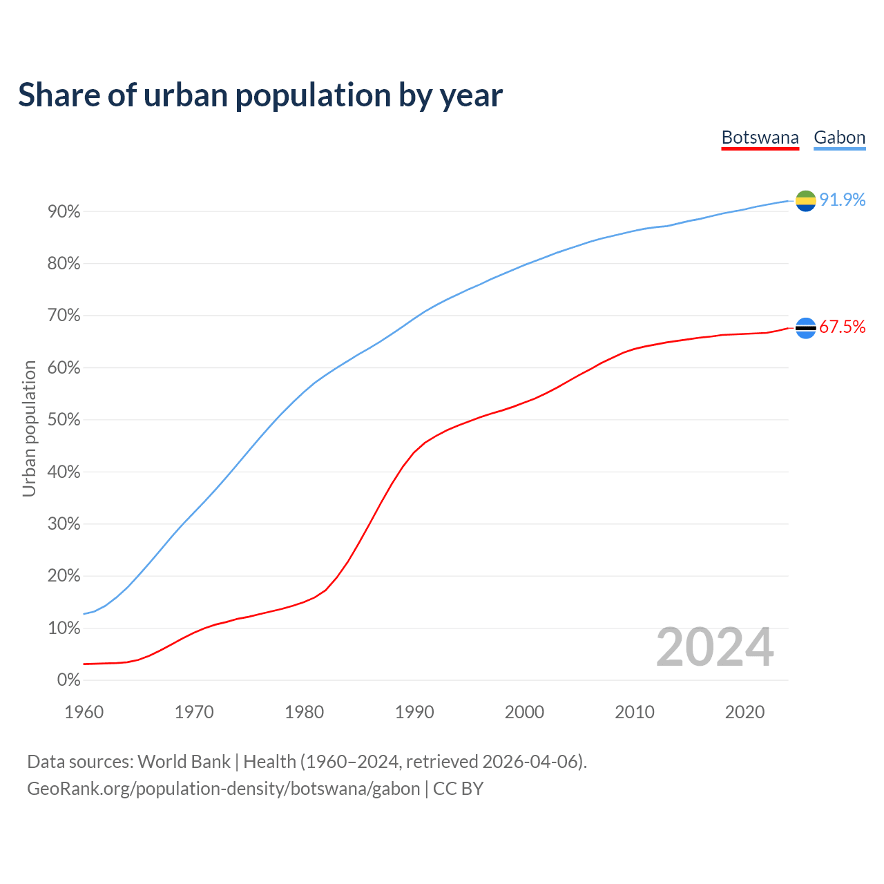From 2004 to 2024, the share of urban population changed from 57.3% to 67.5% in Botswana and from 82.7% to 91.9% in Gabon.