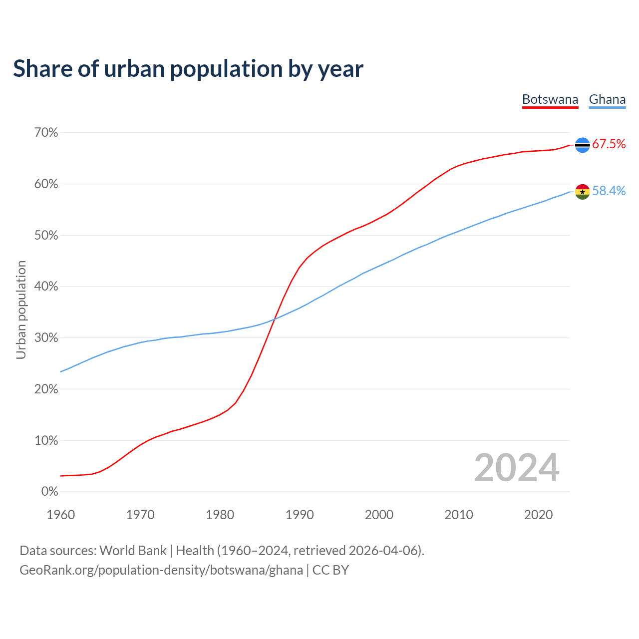 From 2004 to 2024, the share of urban population changed from 57.3% to 67.5% in Botswana and from 46.8% to 58.4% in Ghana.