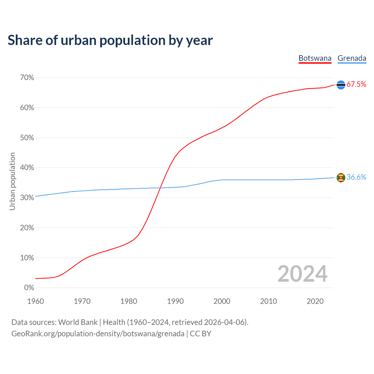 From 2004 to 2024, the share of urban population changed from 57.3% to 67.5% in Botswana and from 35.9% to 36.6% in Grenada.
