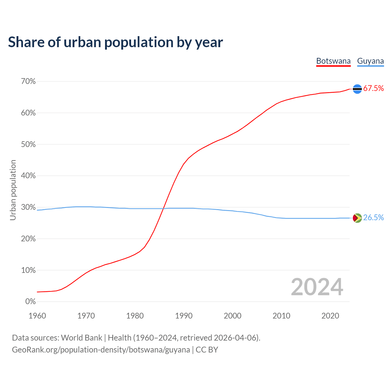 From 2004 to 2024, the share of urban population changed from 57.3% to 67.5% in Botswana and from 28.1% to 26.5% in Guyana.