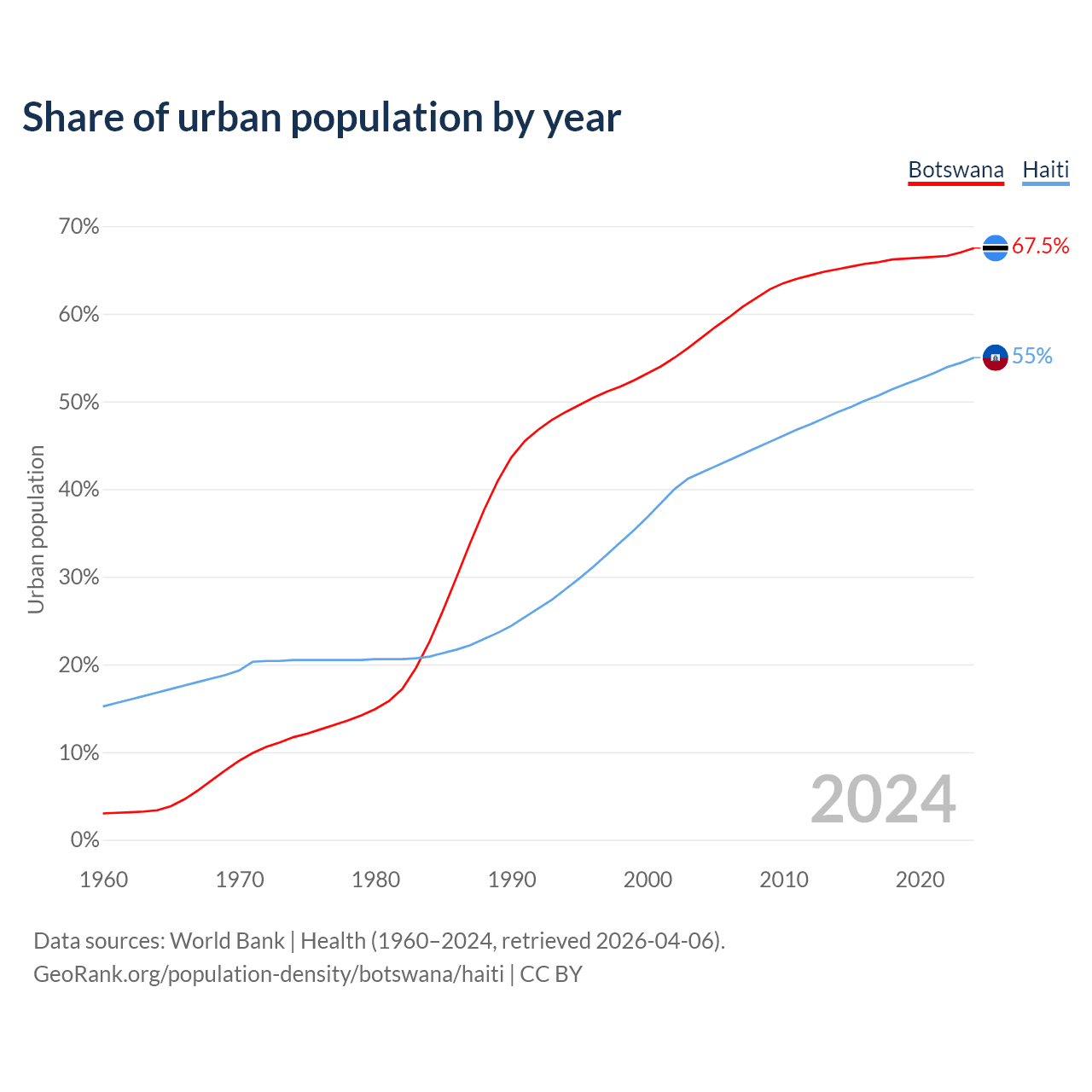 From 2004 to 2024, the share of urban population changed from 57.3% to 67.5% in Botswana and from 41.9% to 55% in Haiti.