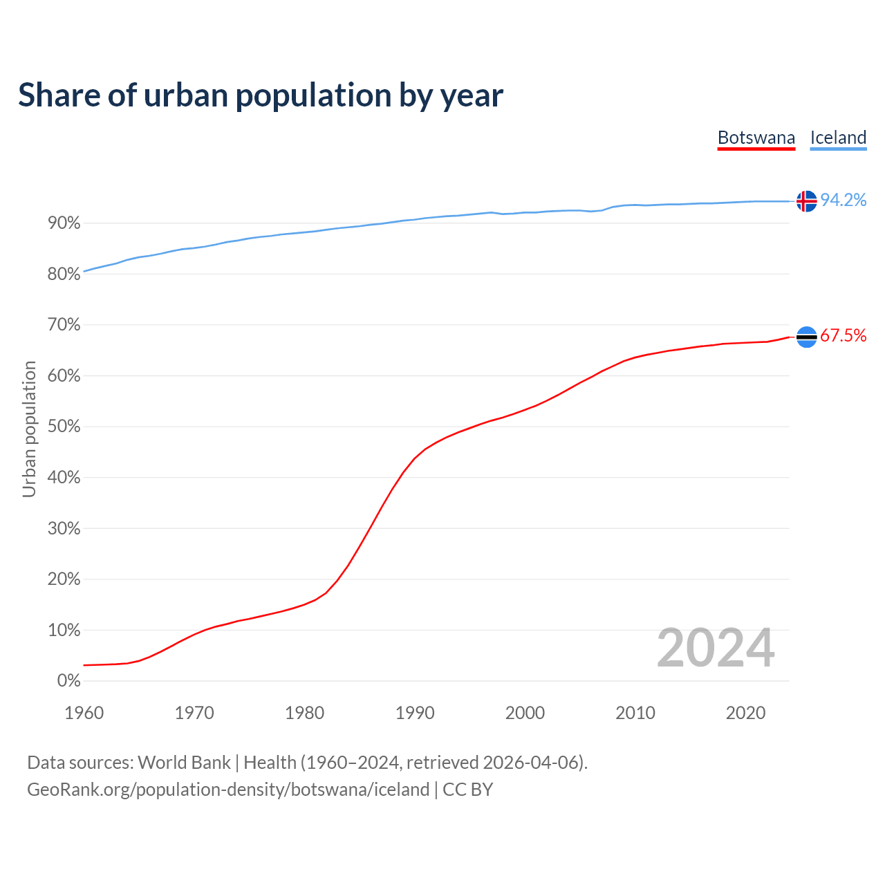 From 2004 to 2024, the share of urban population changed from 57.3% to 67.5% in Botswana and from 92.4% to 94.2% in Iceland.
