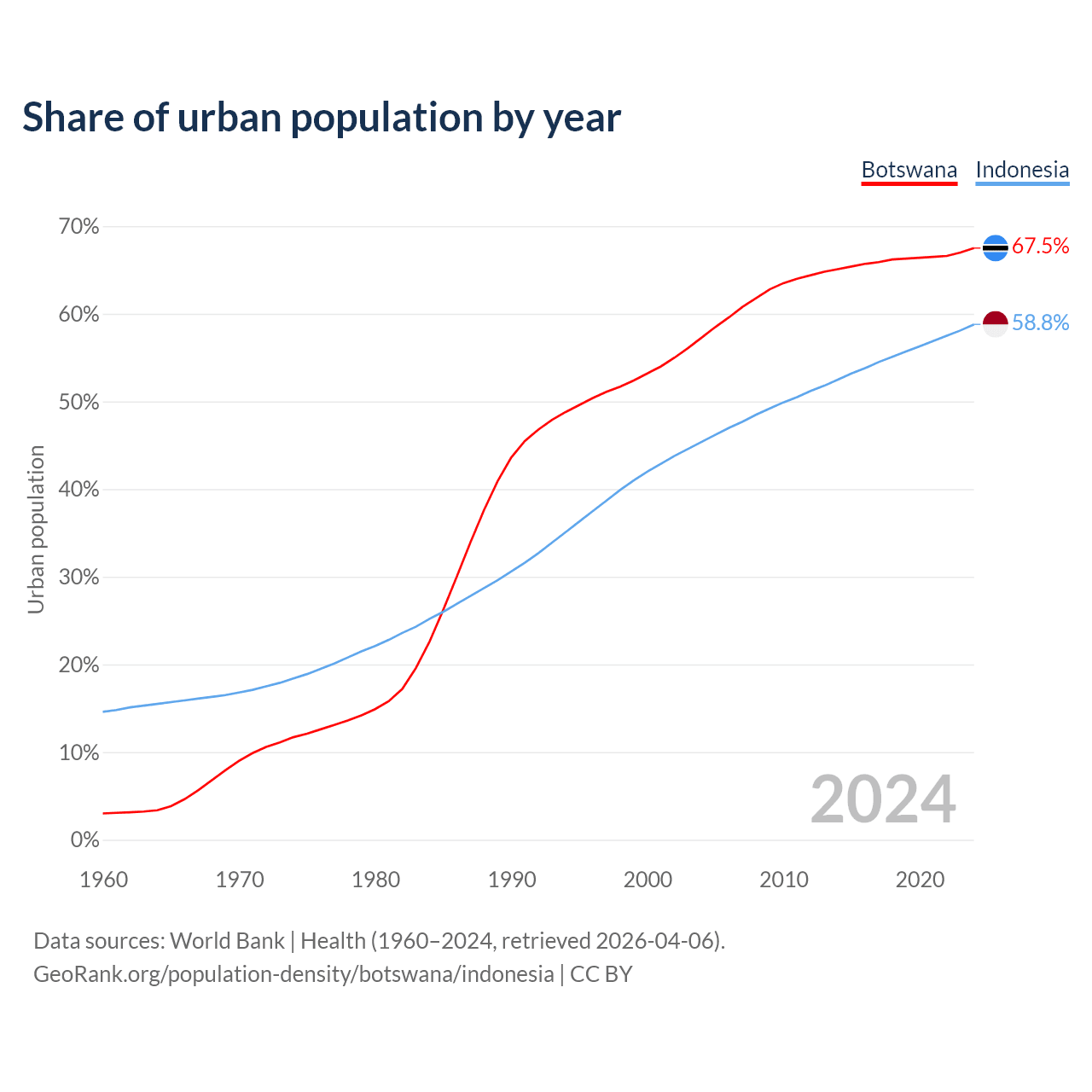 From 2004 to 2024, the share of urban population changed from 57.3% to 67.5% in Botswana and from 45.4% to 58.8% in Indonesia.