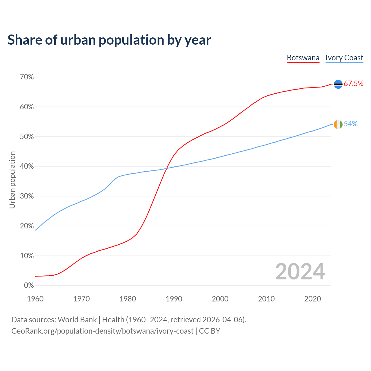 From 2004 to 2024, the share of urban population changed from 57.3% to 67.5% in Botswana and from 44.7% to 54% in Ivory Coast.