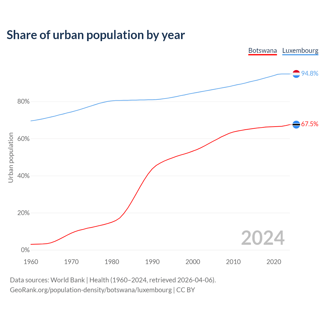 From 2004 to 2024, the share of urban population changed from 57.3% to 67.5% in Botswana and from 86% to 94.8% in Luxembourg.
