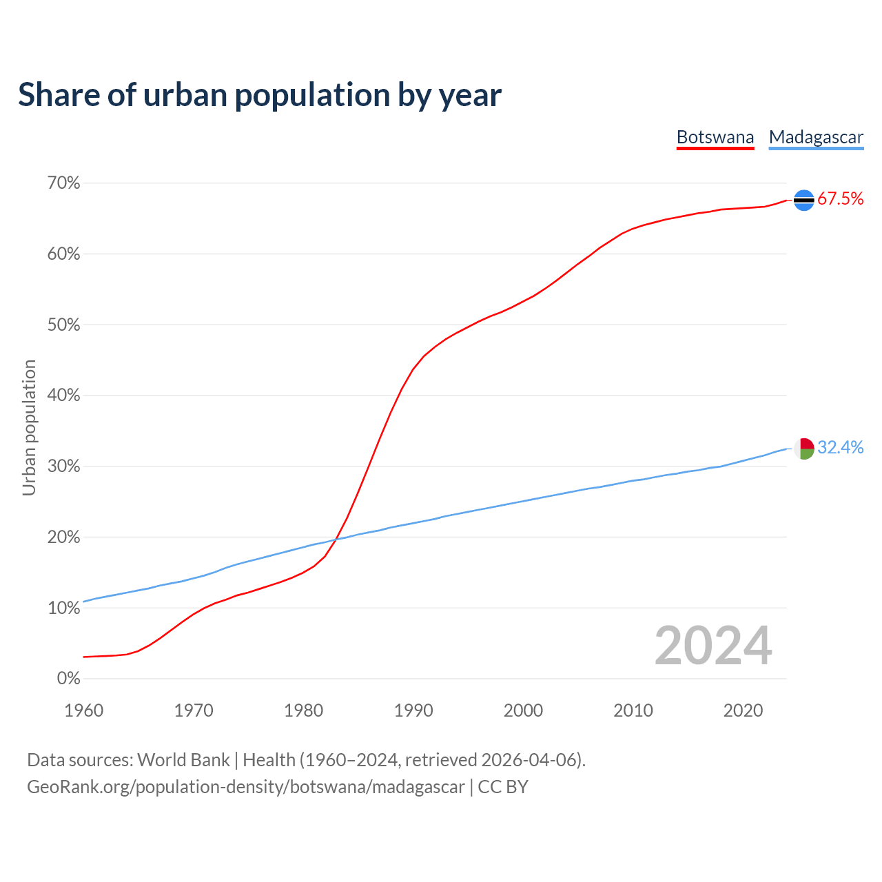 From 2004 to 2024, the share of urban population changed from 57.3% to 67.5% in Botswana and from 26.2% to 32.4% in Madagascar.