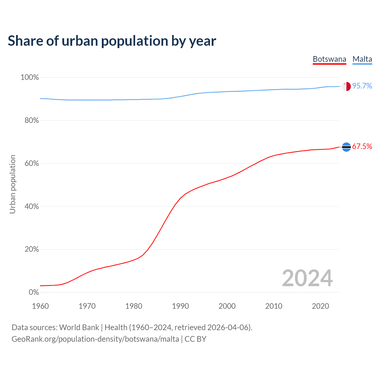 From 2004 to 2024, the share of urban population changed from 57.3% to 67.5% in Botswana and from 93.6% to 95.7% in Malta.