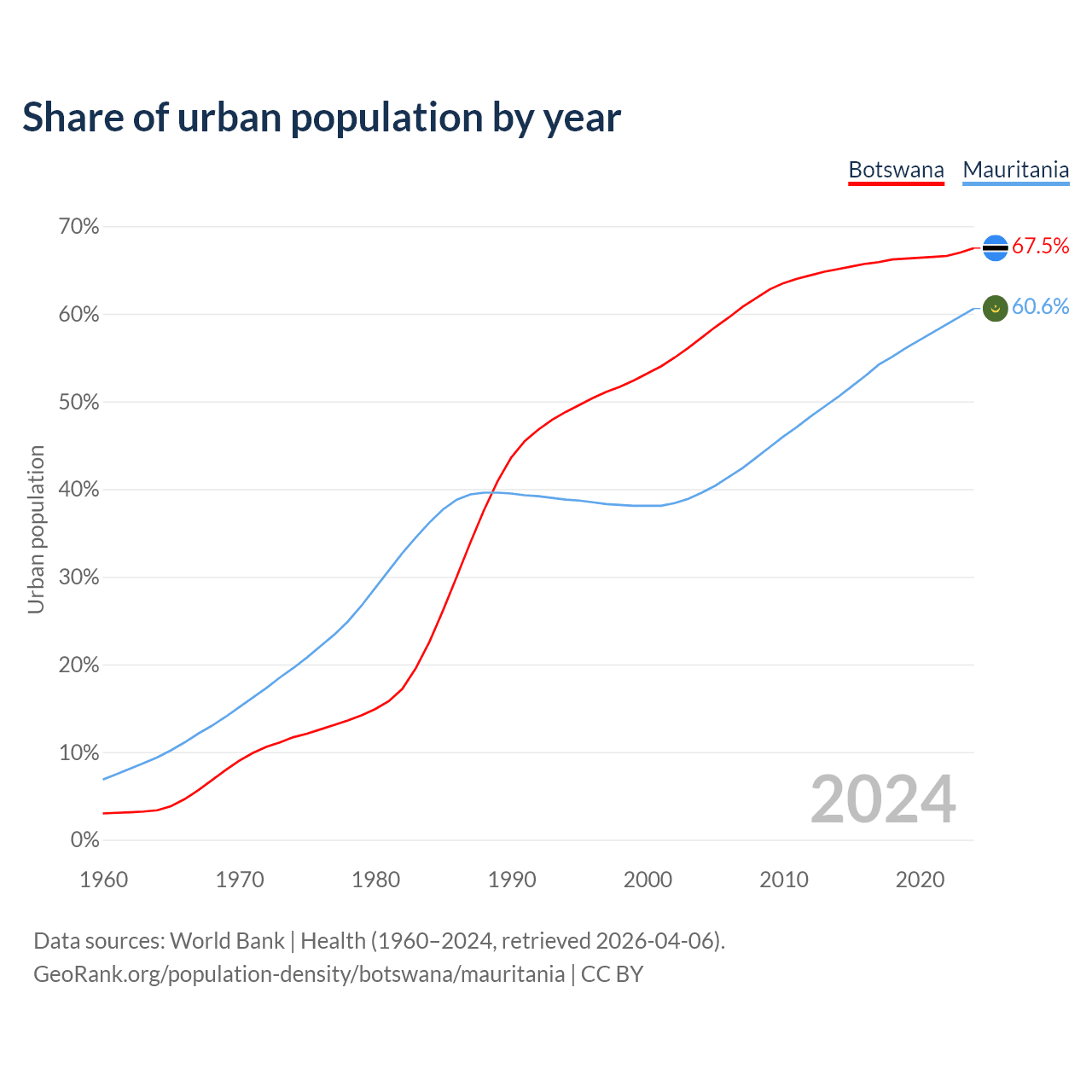 From 2004 to 2024, the share of urban population changed from 57.3% to 67.5% in Botswana and from 39.6% to 60.6% in Mauritania.