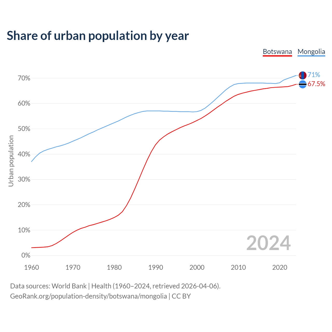 From 2004 to 2024, the share of urban population changed from 57.3% to 67.5% in Botswana and from 60.8% to 71% in Mongolia.