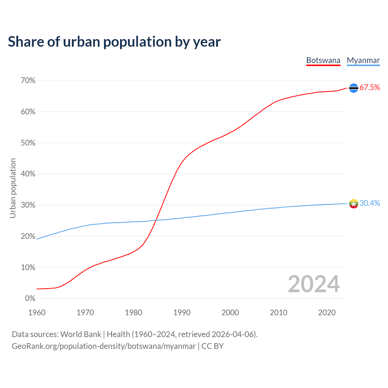 From 2004 to 2024, the share of urban population changed from 57.3% to 67.5% in Botswana and from 28.2% to 30.4% in Myanmar.