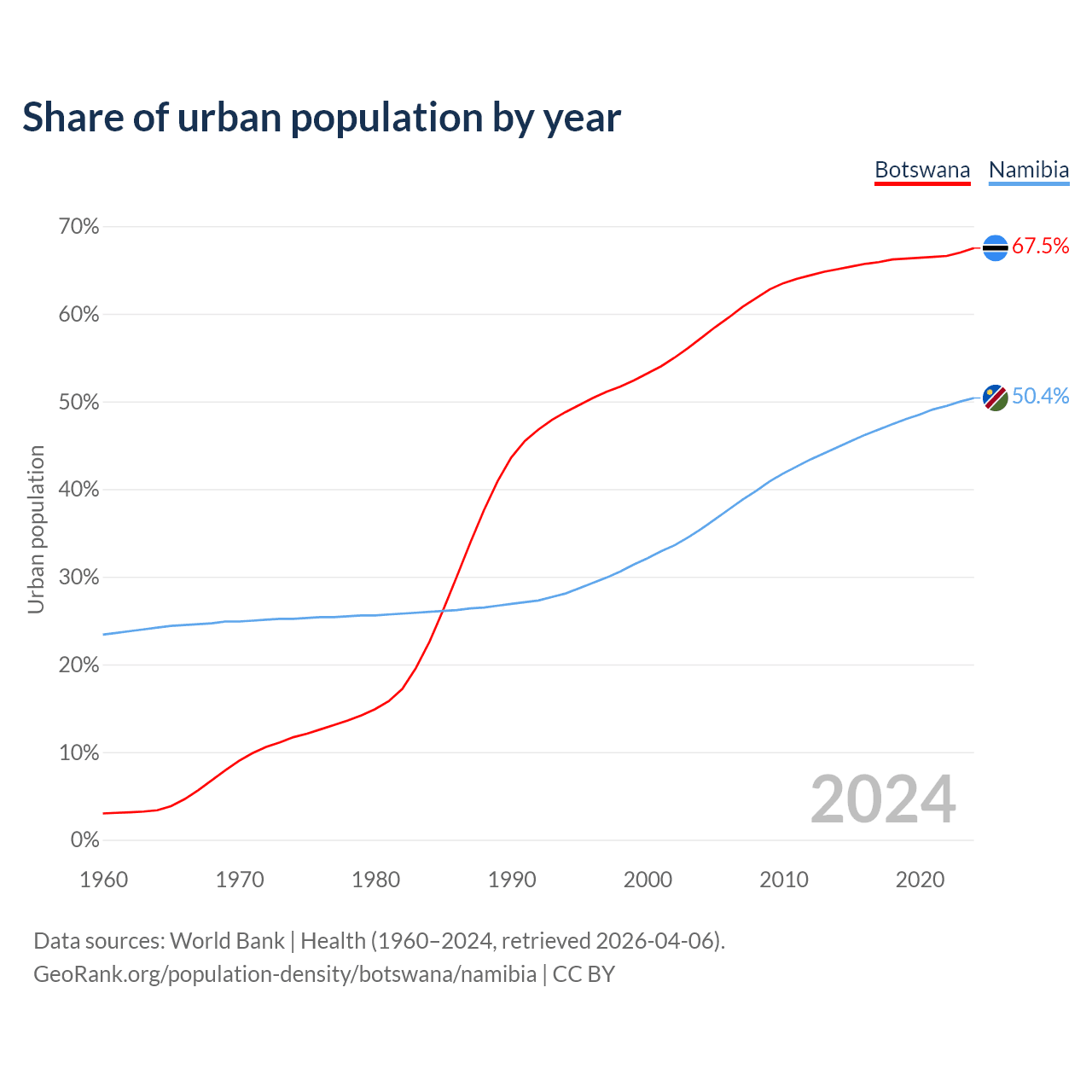 From 2004 to 2024, the share of urban population changed from 57.3% to 67.5% in Botswana and from 35.5% to 50.4% in Namibia.