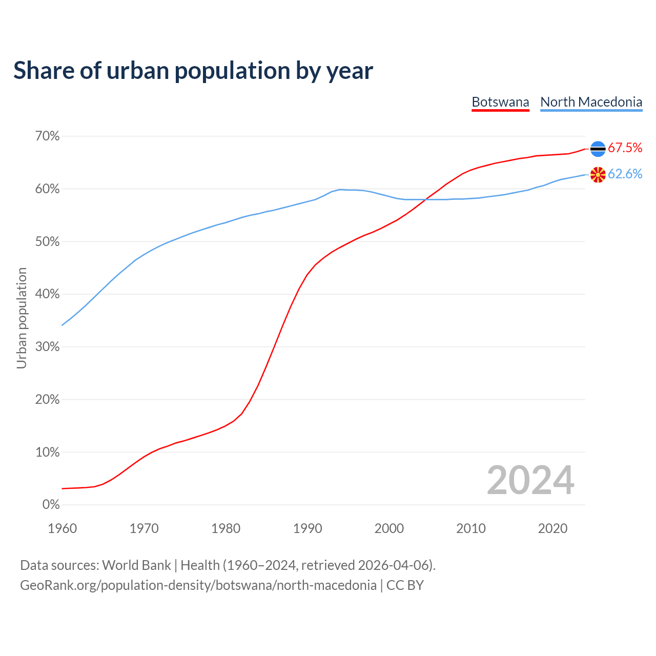 From 2004 to 2024, the share of urban population changed from 57.3% to 67.5% in Botswana and from 57.9% to 62.6% in North Macedonia.