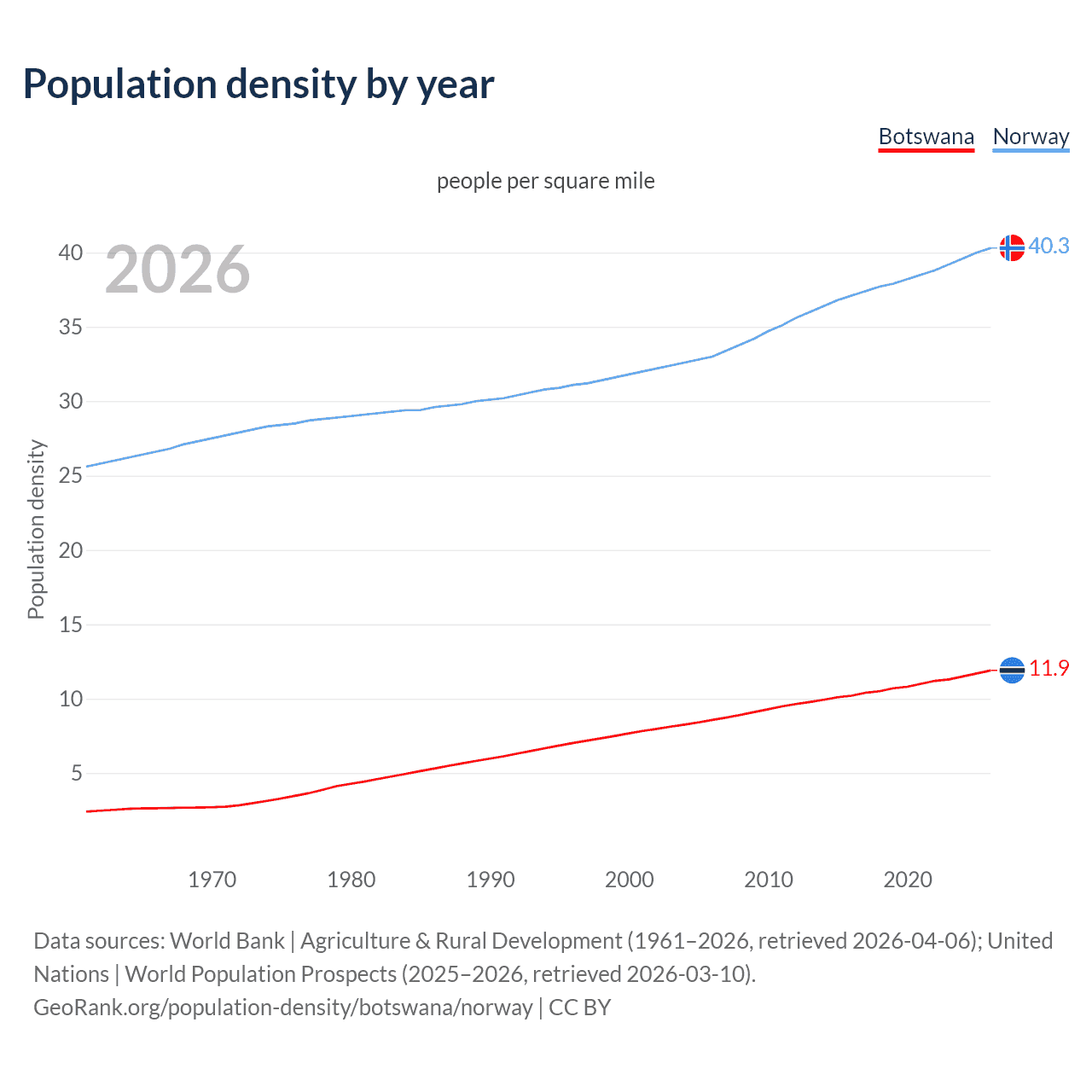 From 2006 to 2026, population density in Botswana increased by 38.9%, compared to a 21.9% growth in Norway.