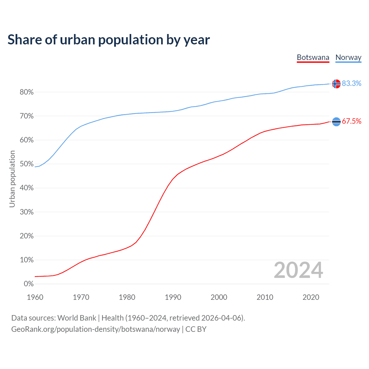 From 2004 to 2024, the share of urban population changed from 57.3% to 67.5% in Botswana and from 77.6% to 83.3% in Norway.