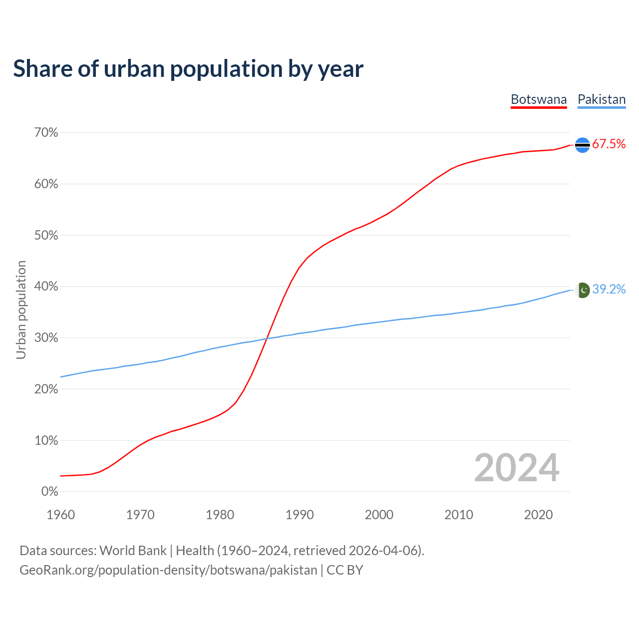 From 2004 to 2024, the share of urban population changed from 57.3% to 67.5% in Botswana and from 33.7% to 39.2% in Pakistan.