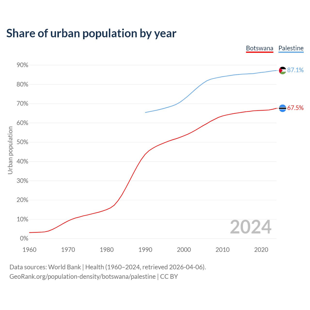 From 2004 to 2024, the share of urban population changed from 57.3% to 67.5% in Botswana and from 79% to 87.1% in Palestine.