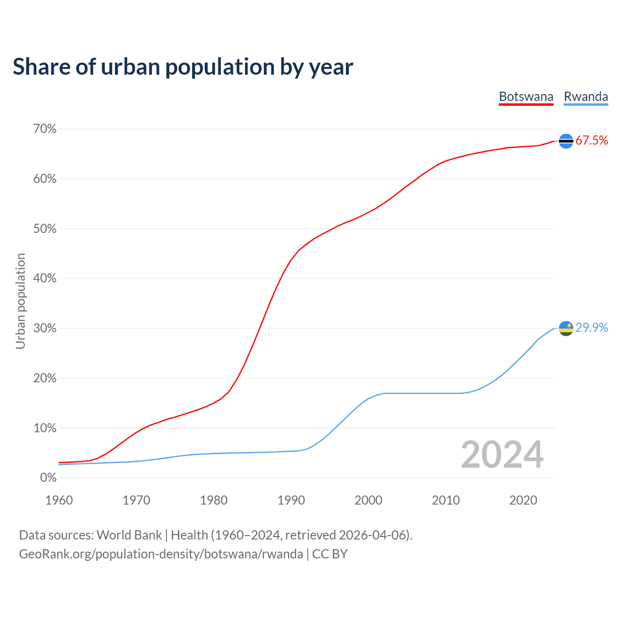 From 2004 to 2024, the share of urban population changed from 57.3% to 67.5% in Botswana and from 16.9% to 29.9% in Rwanda.