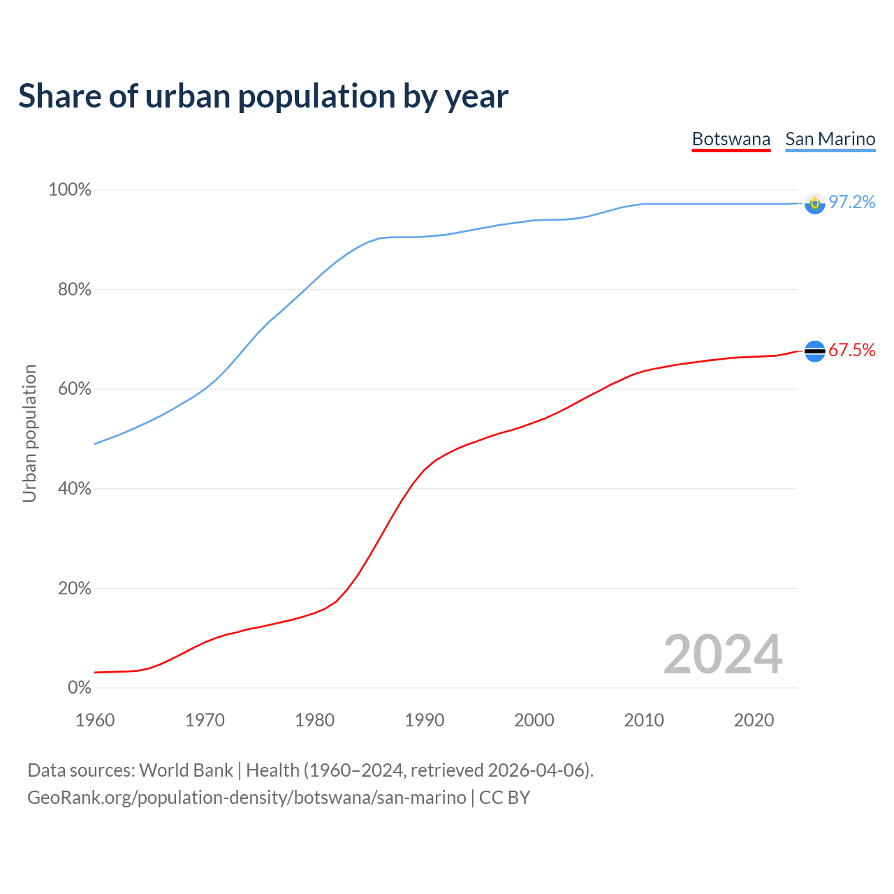 From 2004 to 2024, the share of urban population changed from 57.3% to 67.5% in Botswana and from 94.2% to 97.2% in San Marino.