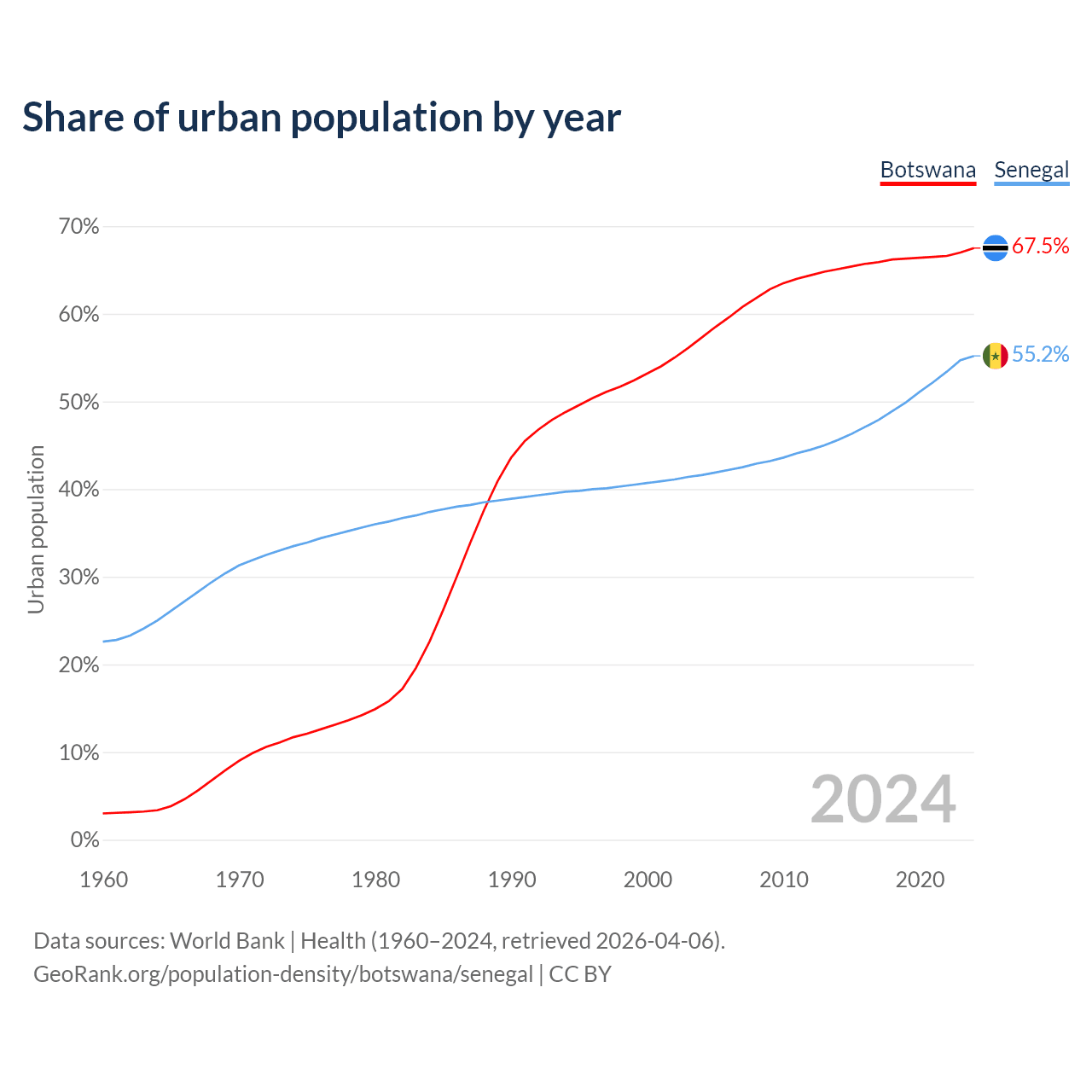 From 2004 to 2024, the share of urban population changed from 57.3% to 67.5% in Botswana and from 41.6% to 55.2% in Senegal.