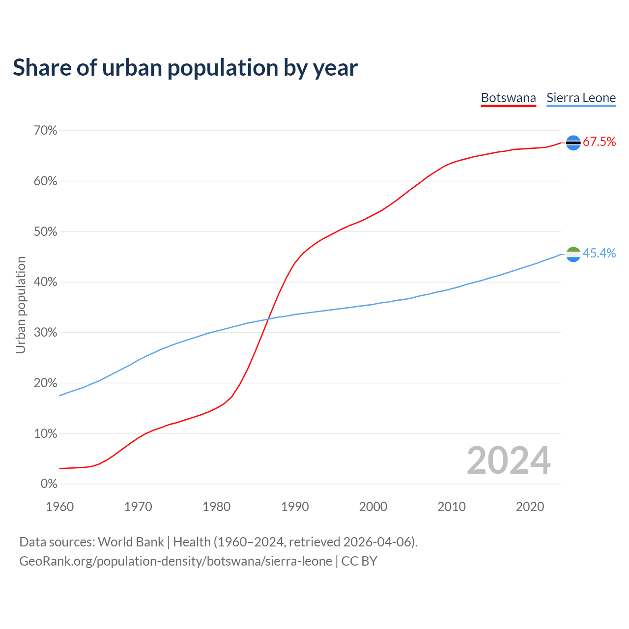 From 2004 to 2024, the share of urban population changed from 57.3% to 67.5% in Botswana and from 36.5% to 45.4% in Sierra Leone.