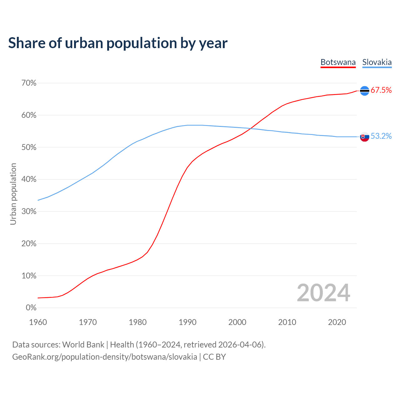 From 2004 to 2024, the share of urban population changed from 57.3% to 67.5% in Botswana and from 55.6% to 53.2% in Slovakia.