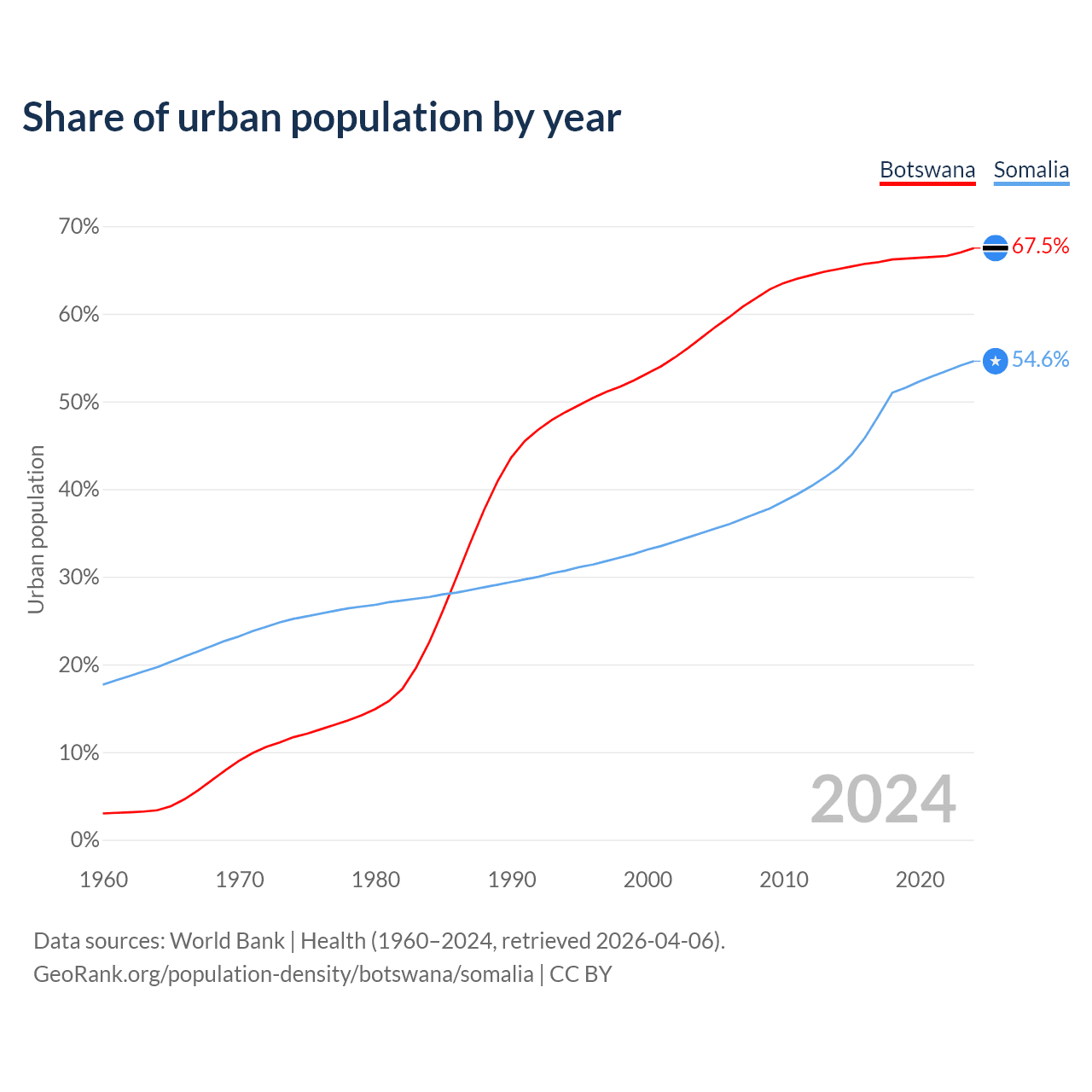 From 2004 to 2024, the share of urban population changed from 57.3% to 67.5% in Botswana and from 35% to 54.6% in Somalia.
